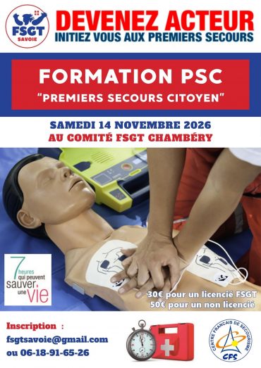 Le Comité FSGT de la Savoie organise le samedi 14 novembre 2026 au siège du Comité (89 rue Nicolas Parent à Chambéry) une formation initiale premiers secours citoyen PSC.