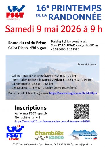 Dans le cadre du 16ème Printemps de la Randonnée FSGT, la commission sport nature du comité de Savoie FSGT et ses clubs Chambaix Rando et Belledonne Sports Nature proposent plusieurs circuits pour le col du Frène à partir de Saint Pierre d’Albigny (Savoie).
