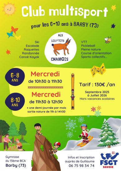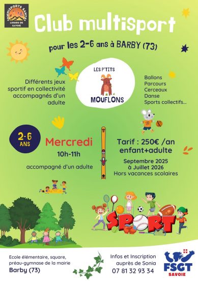 Le club FSGT des PETITS MOUFLONS accueille les 2-6 ans à Barby (préau-gymnase de l’école élémentaire) le mercredi matin.