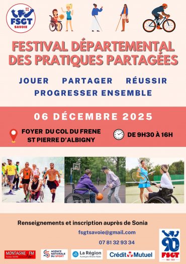 Le 2ème Festival des Pratiques Partagées est organisé par le comité FSGT Savoie le samedi 6 décembre 2025 au foyer du col du Frêne à Saint Pierre d’Albigny de 9h30 à 16h.
