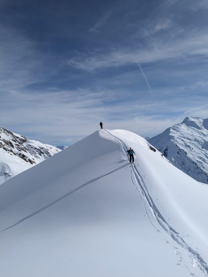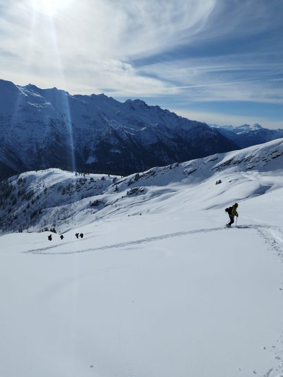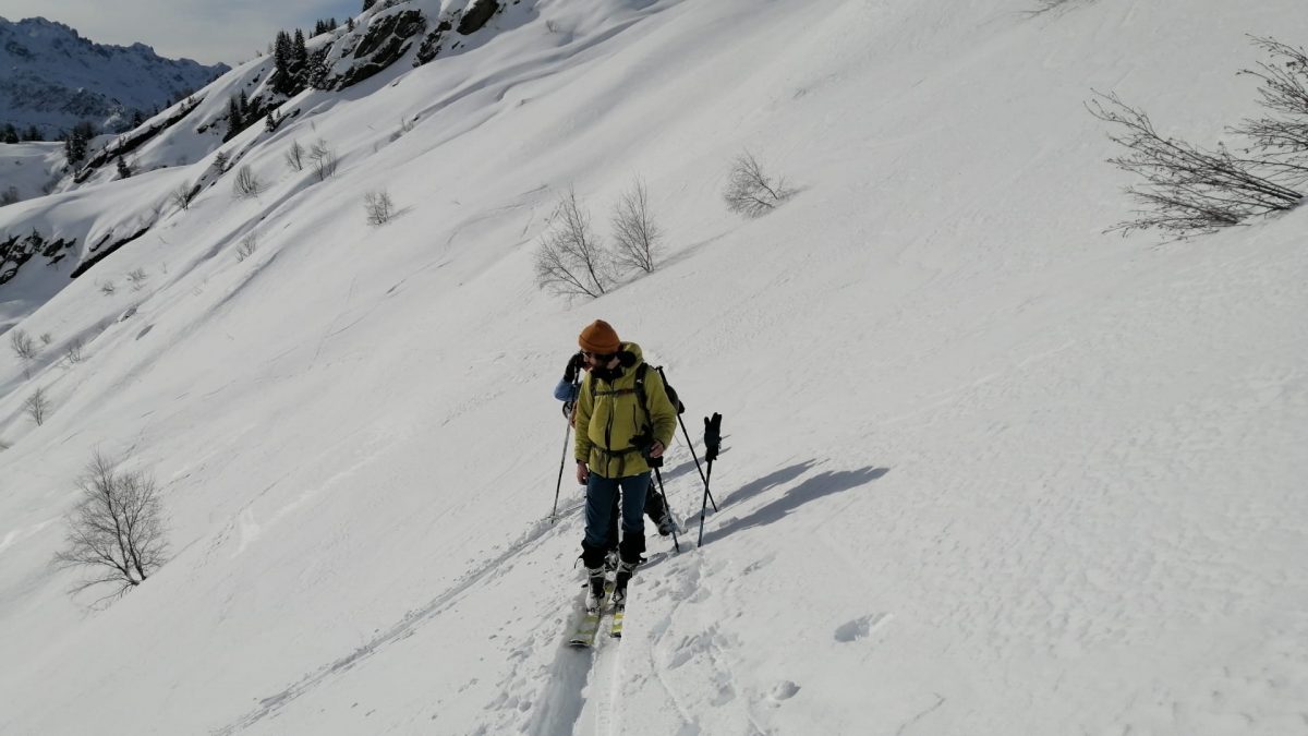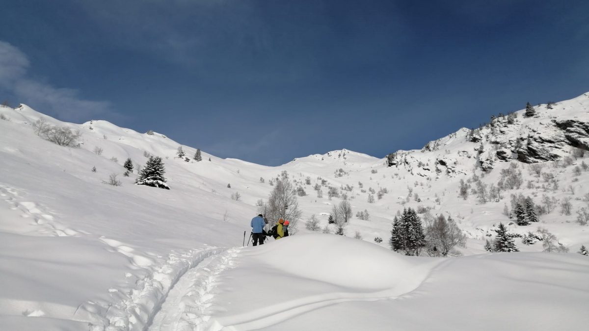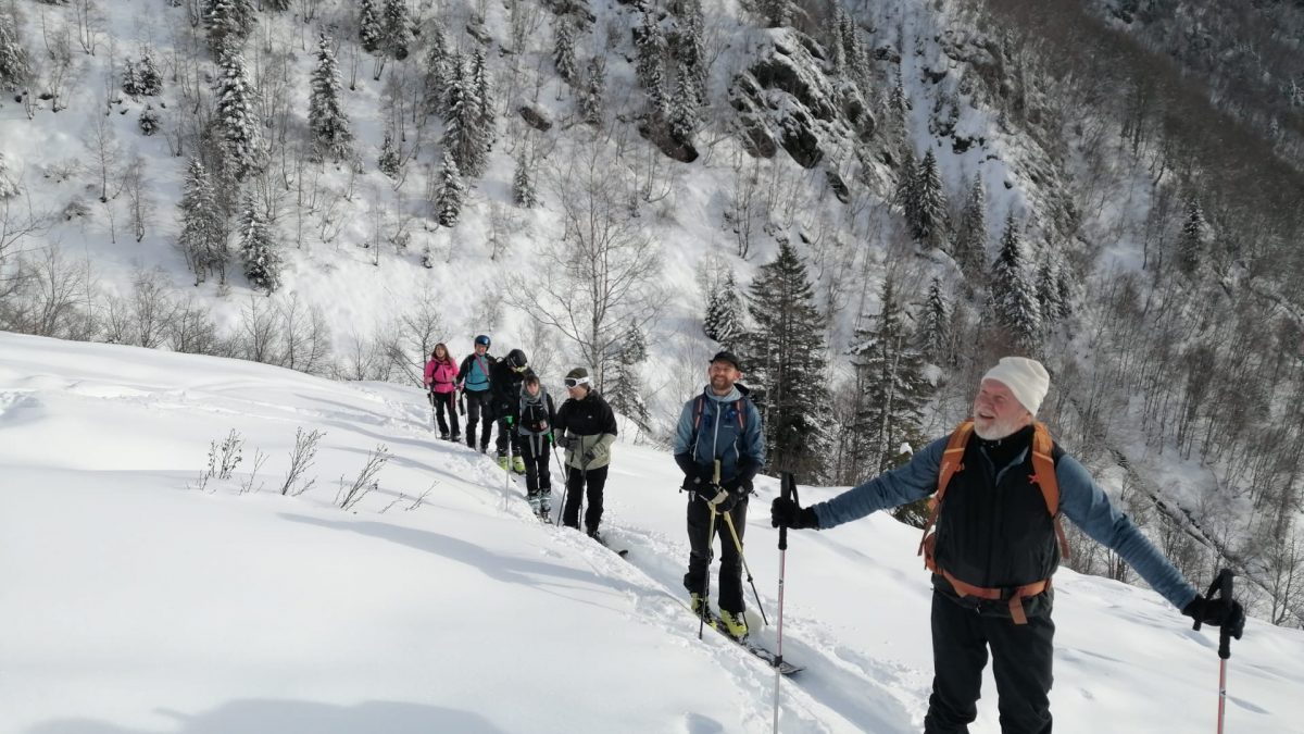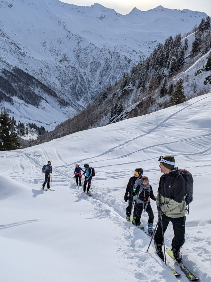 Les pratiquant·es, toutes et tous autonomes et équipé·es du matériel de sécurité obligatoire (DVA, pelle et sonde), ont construit ensemble leur itinéraire, avec un dénivelé positif total de 1 200 m. Après une première étape vers le Char de la Turche (750 m D+), le groupe a poursuivi vers le Petit Arc (1 100 m D+).